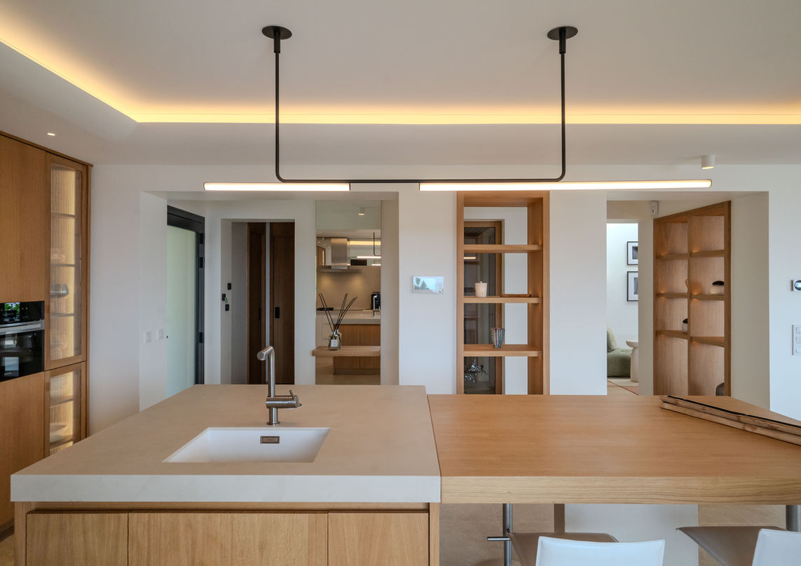 Une attention particulière a été portée à la cohérence des boiseries, des portes intérieures à la cave à vin centrale, en passant par les niches décoratives et la cuisine : chaque élément contribue à l’élégance chaleureuse de cette villa.