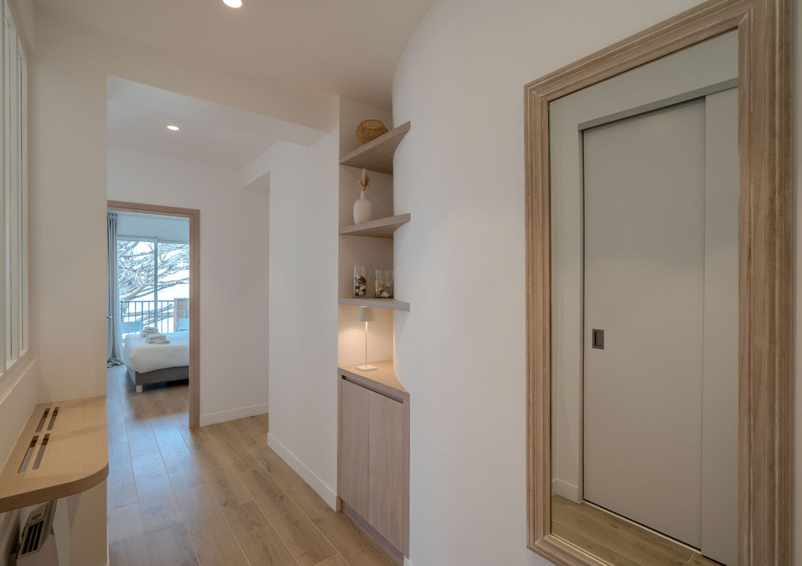 Il s’est donc agit d’optimiser au maximum les espaces en supprimant par exemple la cuisine fermée pour l’intégrer dans l’espace de vie afin de pouvoir créer la seconde chambre qui disposait alors de sa baie vitrée. Les vues mer de chaque pièce était alors garantie ! Beaucoup d’astuces de Design ont été nécessaires pour disposer de suffisamment de rangements et fonctionnalités dans chaque pièce : dressing en mode Lit-pont dans la petite chambre avec une partie courbée masquant la colonne technique, petit coin bureau rabattable dans la « grande » chambre pour pouvoir télé-travailler, petite verrière dans le hall d’entrée pour augmenter l’impression d’espace… La conception des meubles et portes, faite de chêne couleur naturelle et médium laqué blanc a permis de créer une ambiance générale très chaleureuse. Quelques touches décoratives comme la crédence cuisine en Zeilig et la salle de bain en effet marbré ont renforcé l’esprit d’un Design doté de touches d’élégance.